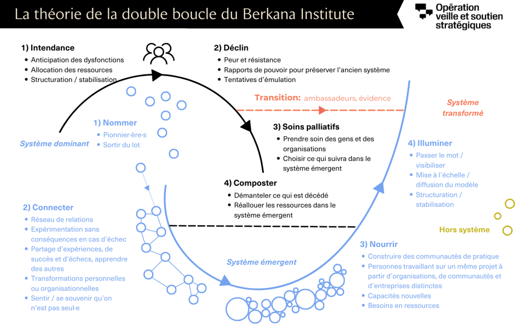 Popularisée notamment par les travaux de l’Institut Berkana, la théorie de la double boucle décrit les grandes phases de transition des systèmes vivants — qu’il s’agisse d’organisations, d’institutions ou de sociétés entières. En voici une excellente illustration élaborée par l’OVSS.